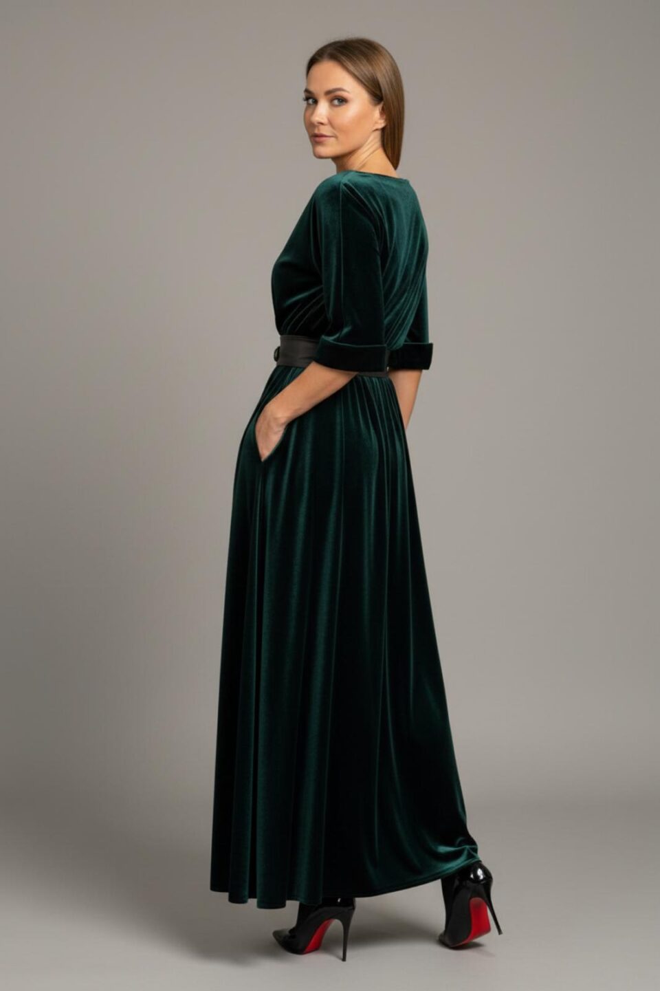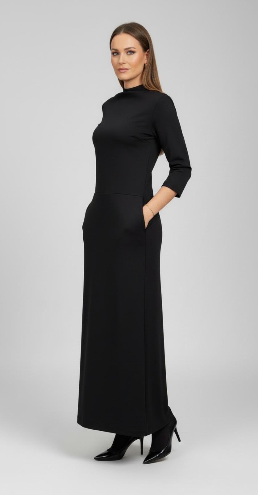 Kleita ar šķēļumu kas izceļ kāju, kleitai ir kabatas